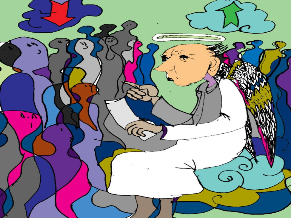 A munkájában sem talált sok örömet. Avval kezdték a műszakot, hogy az éjjel érkezett lelkek egy részét, egy-két millió évre átirányították a purgatóriumba, de a férgesét azonnali hatállyal a pokolba küldték. – Az elkárhozottak között aztán rögvest „lett légyen sírás, és az fogaknak nagy csikorgatása” –, de nem volt fellebbezés. Hiába is gondolták egyesek, hogy csak vicc az egész, mert hiszen mindegyik lélek angyalnak érezte magát. De mikor rájöttek, hogy itt nincs kecmec, szitkozódva fogták a motyóikat, és hagyták, hogy a lángpallosos őrangyalok visszatereljék őket Szent Péter strázsahelyére.